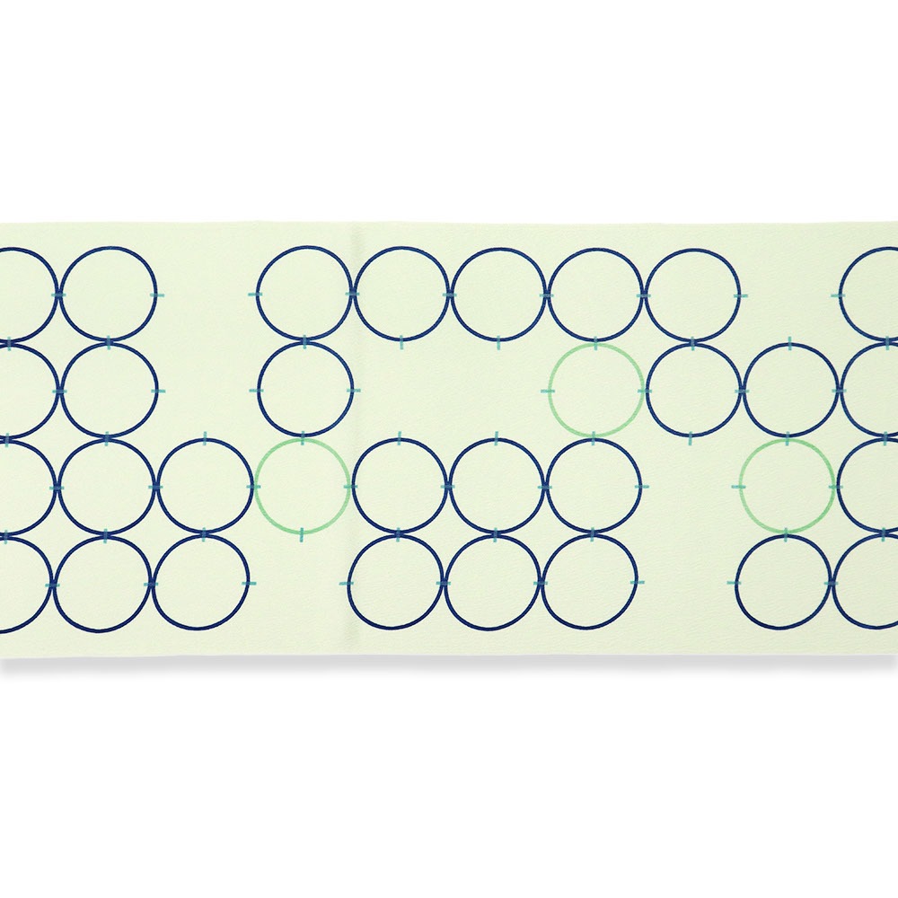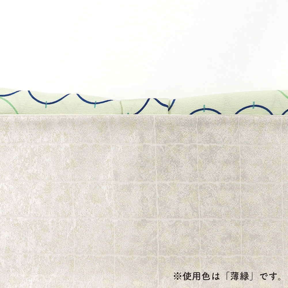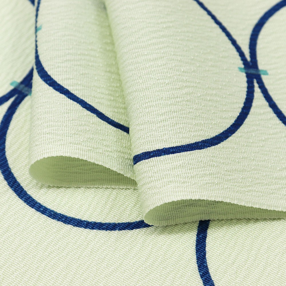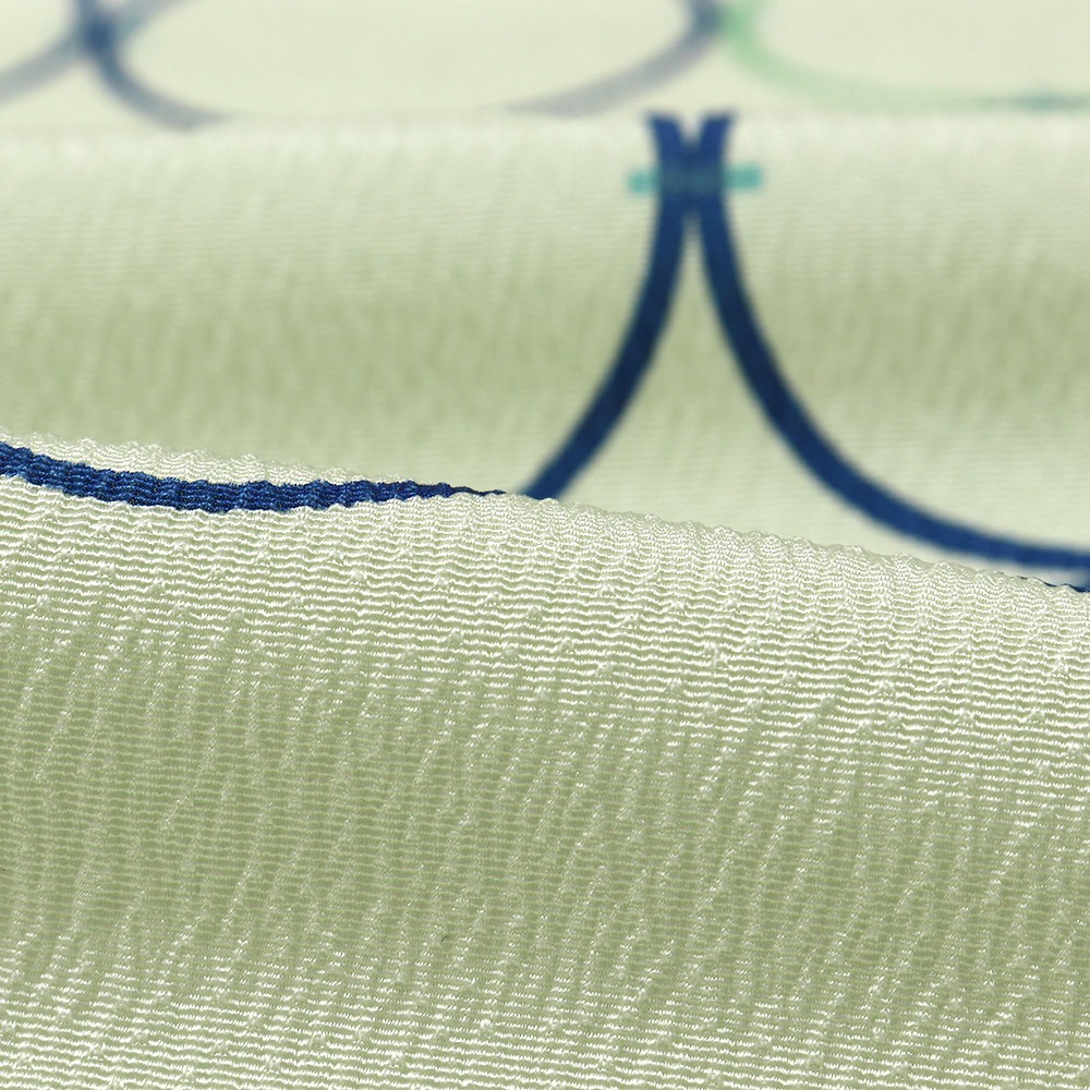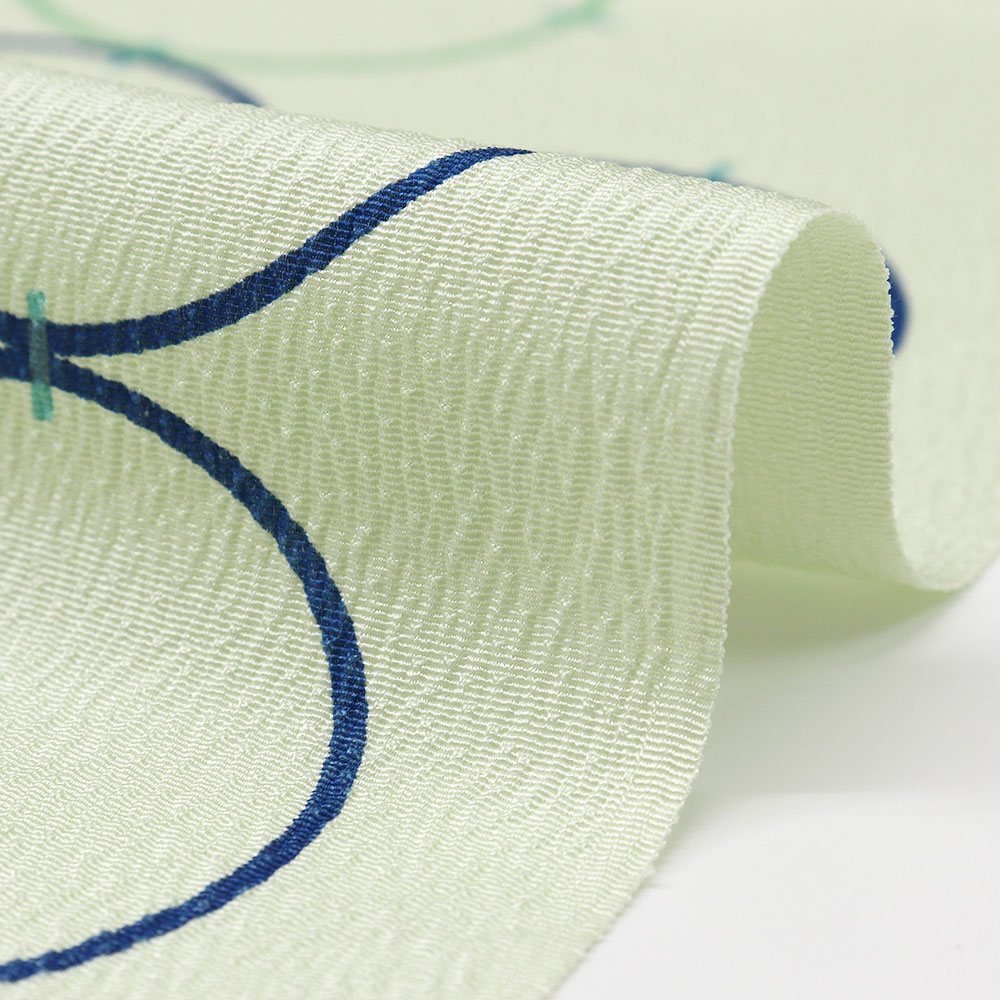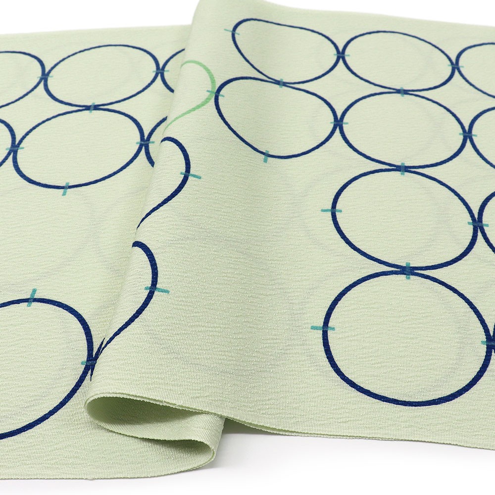 薄緑色に染めた丹後ちりめんに、輪つなぎが描かれたポップなデザインです。楊柳のような縦シボが入っているのもポイント◎