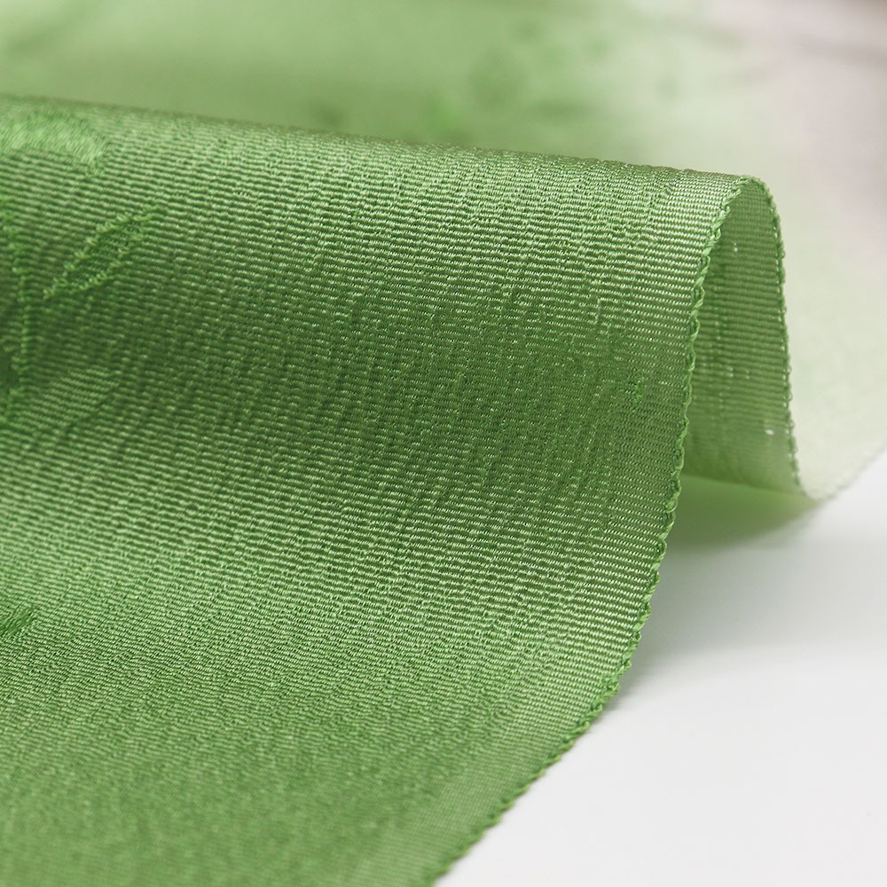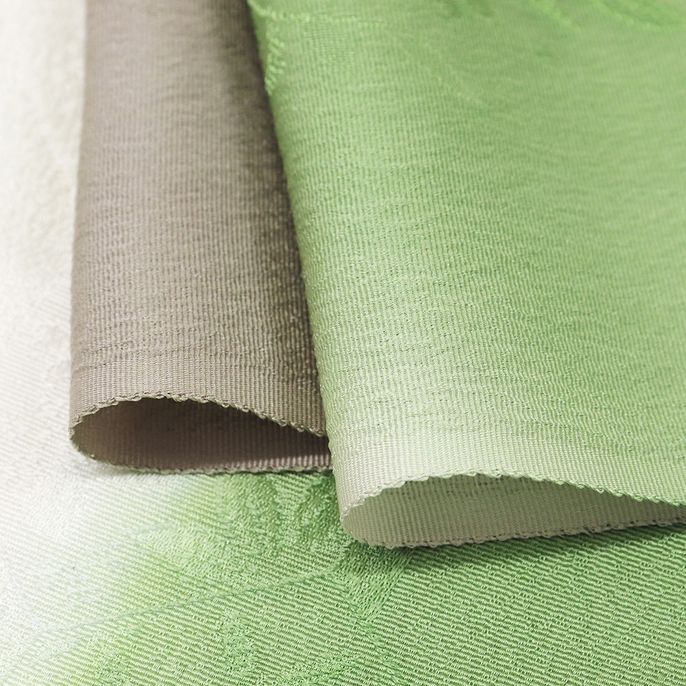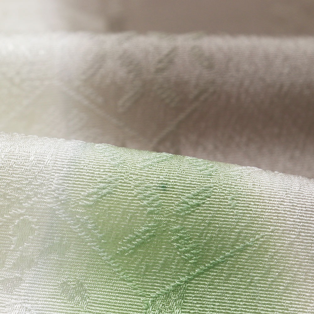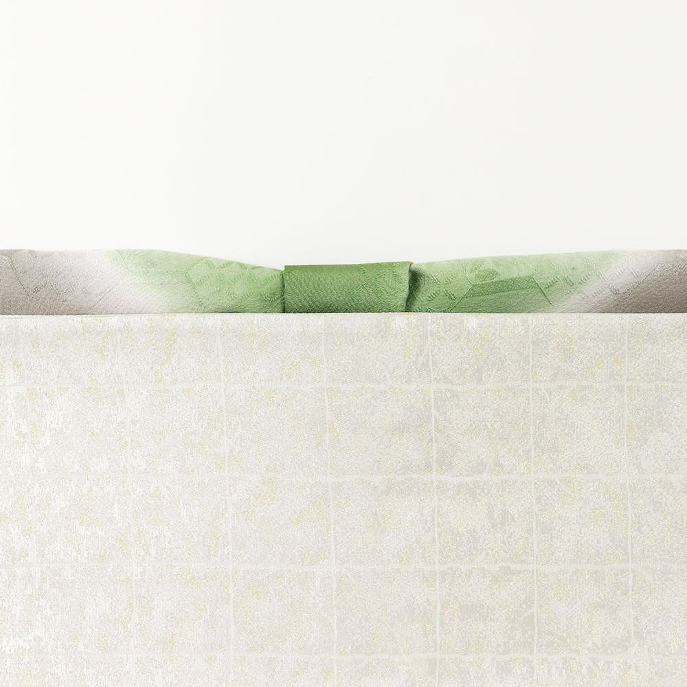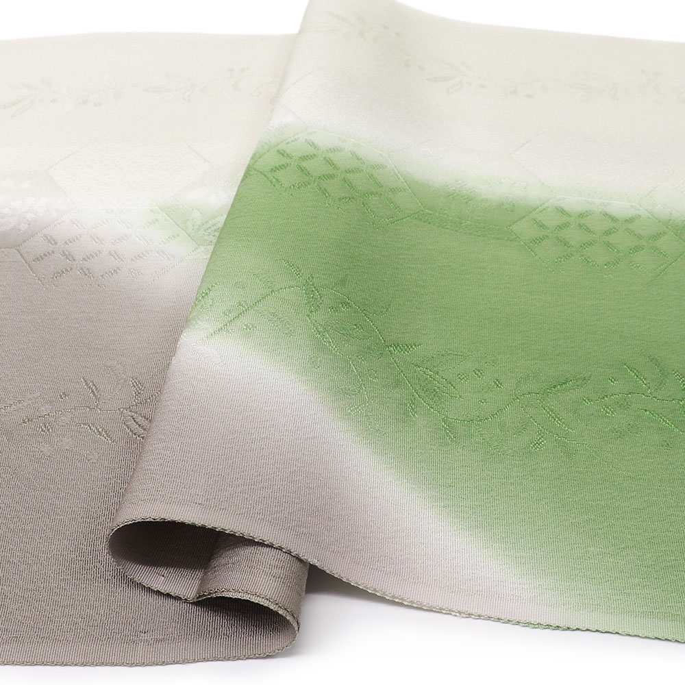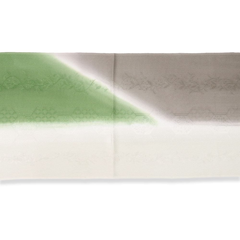 しなやかなハリのある正絹地に、縦分けで斜めぼかしを染めた一枚。鮮やかな緑と落ち着いたベージュで、明るい印象とお落ち着いた印象を使い分けられるデザインです。