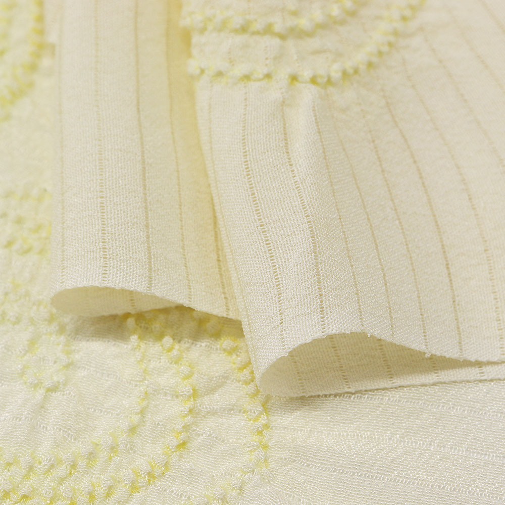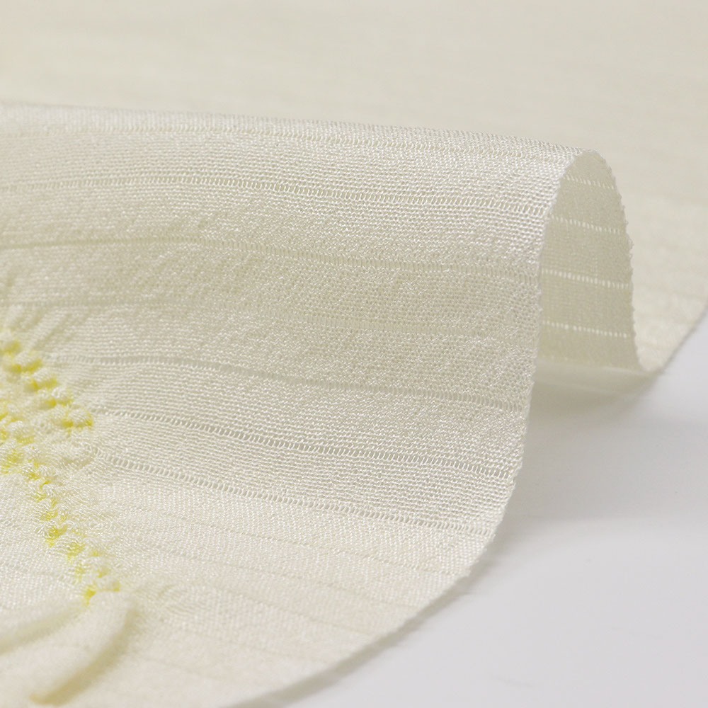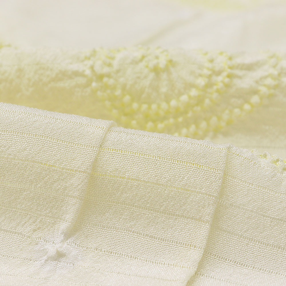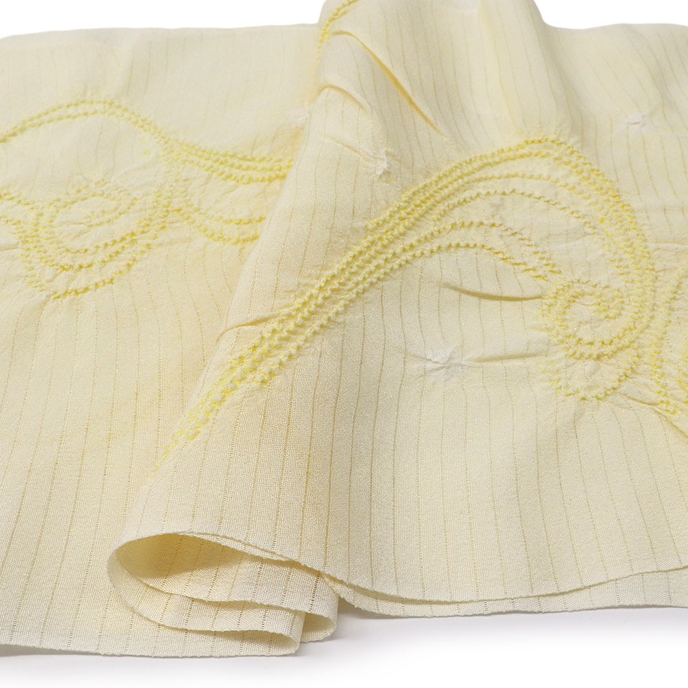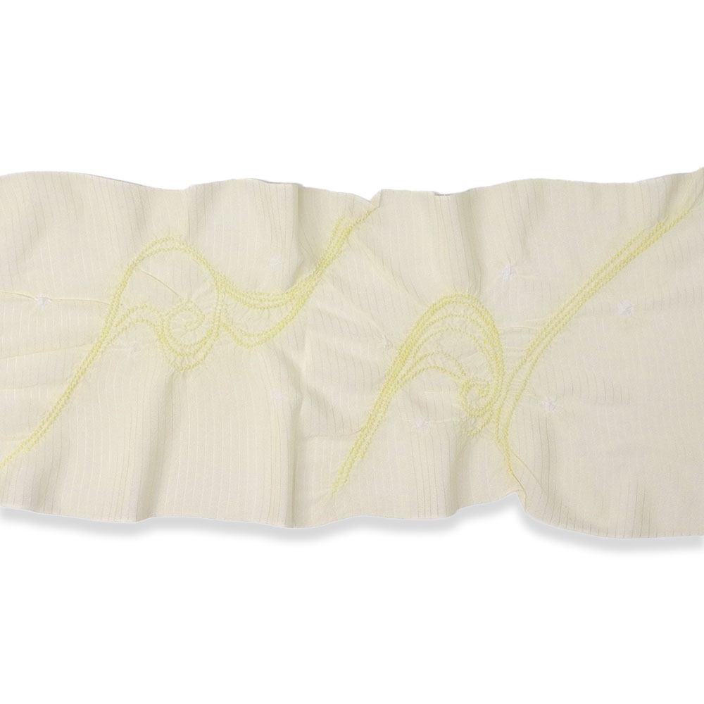 薄黄色の地に黄色の渦文を絞りで染め出した夏の一枚。正絹の絽生地は、しっかりとした風合いはそのままにやわらかな手触りと通気性の良さが魅力的。ふわっとしたぼかし模様と涼し気な絽生地が、暑い日のカジュアルファッションを彩ってくれます。