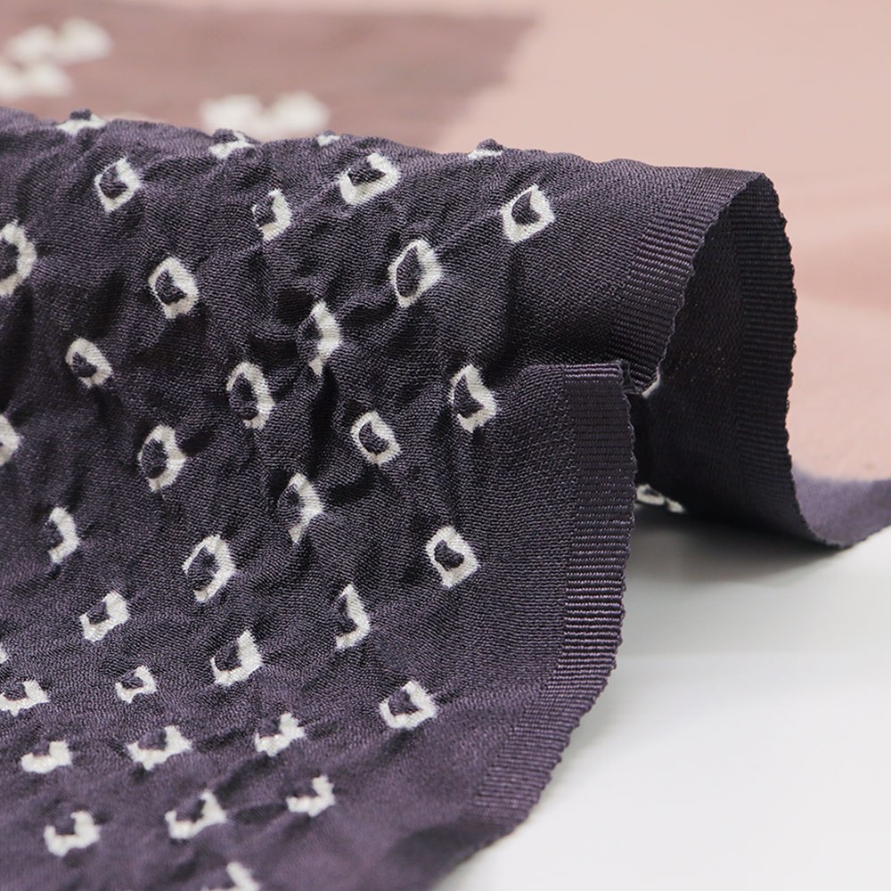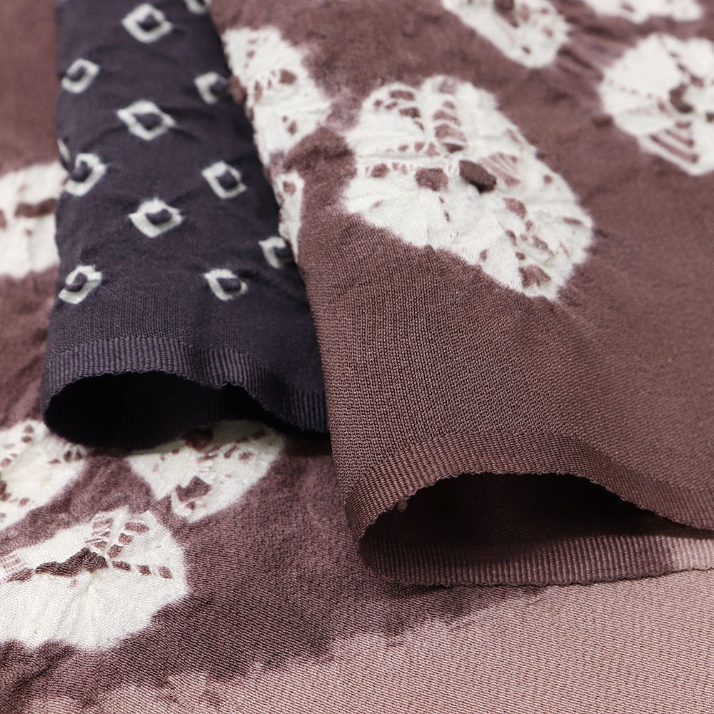 柔らかなちりめん地に、絞り染めを施した一枚です。様々な色合いをブロックのように配したモダンなデザイン。白い絞り模様がカラフルな配色のなかで際立ち、絞りならではの立体感も存分に楽しめる仕上がりです。