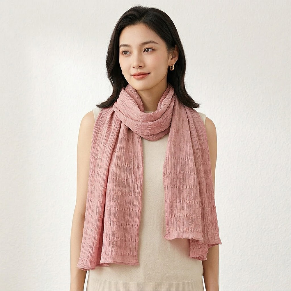 透明感のある絹地に、クリンクル加工(シワ加工)を施した軽やかな仕上がり。