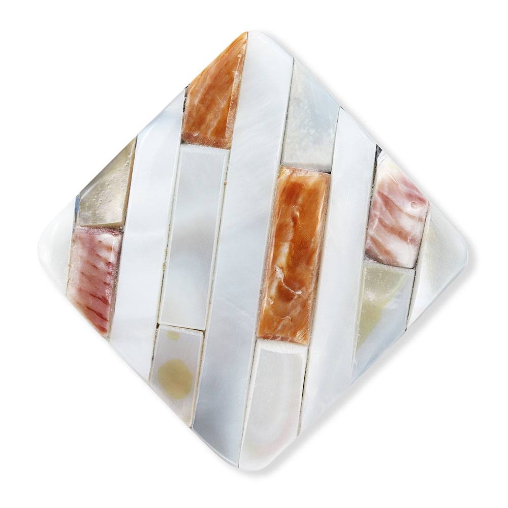 貝を使用し、温もりがあふれるアイテムを創り出す【リオン工芸】による、スクエア型の貝帯留。
