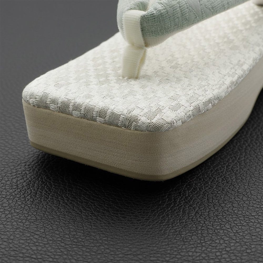 アイボリーの天と、洋花模様の鼻緒を組み合わせた一足。優しい丸みを持たせたスクエア型は、履いたときにもすっきりとしたスマートな印象になるでしょう。