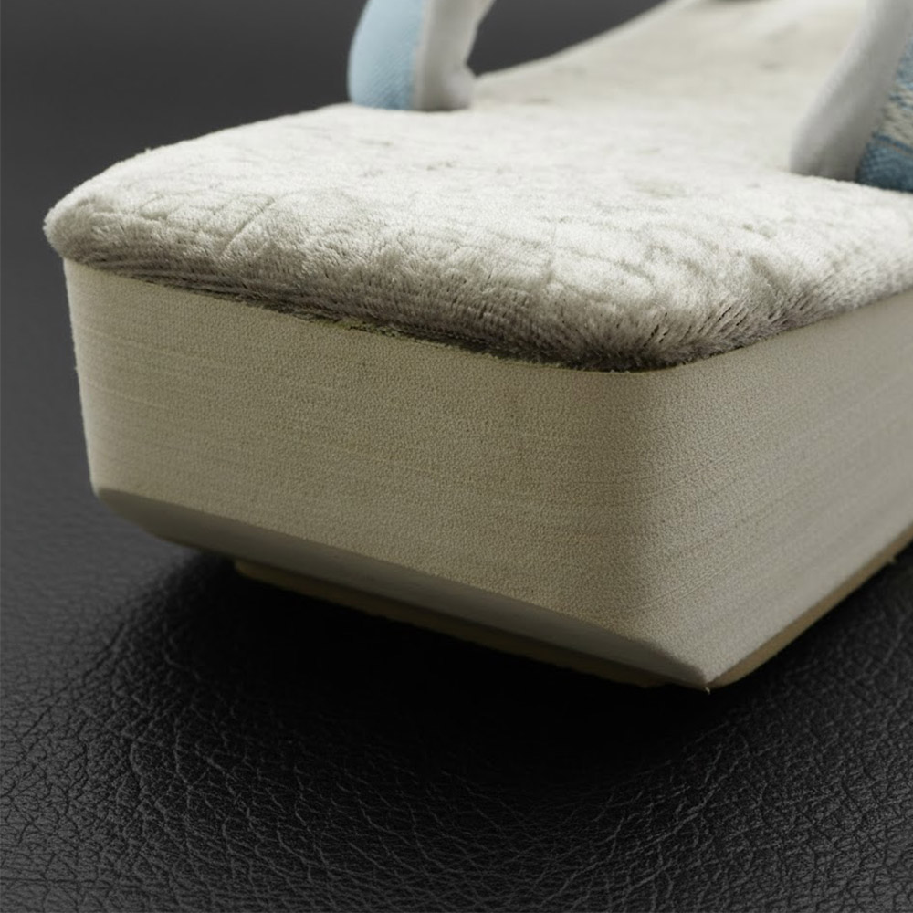 グレーのボア生地の天と、幾何模様の絹生地を鼻緒に組み合わせた一足。優しい丸みを持たせたスクエア型は、履いたときにもすっきりとしたスマートな印象になるでしょう。