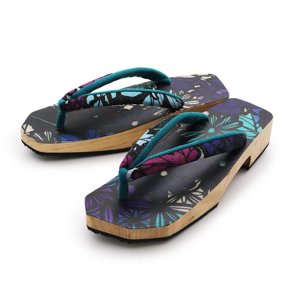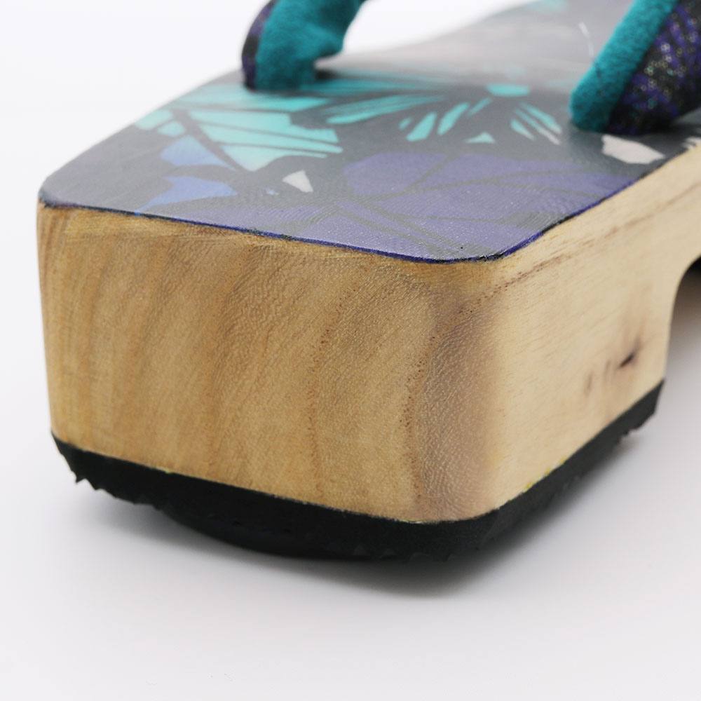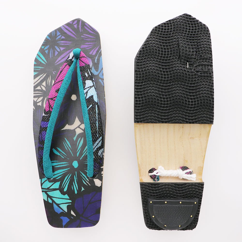 こちらの下駄は、黒澤桐材店の職人の手作業によってつくられた桐台に、小室庵による染生地を全面に張った一足。桐材の美しい木目と染生地の調和があなたの足を飾ります。
