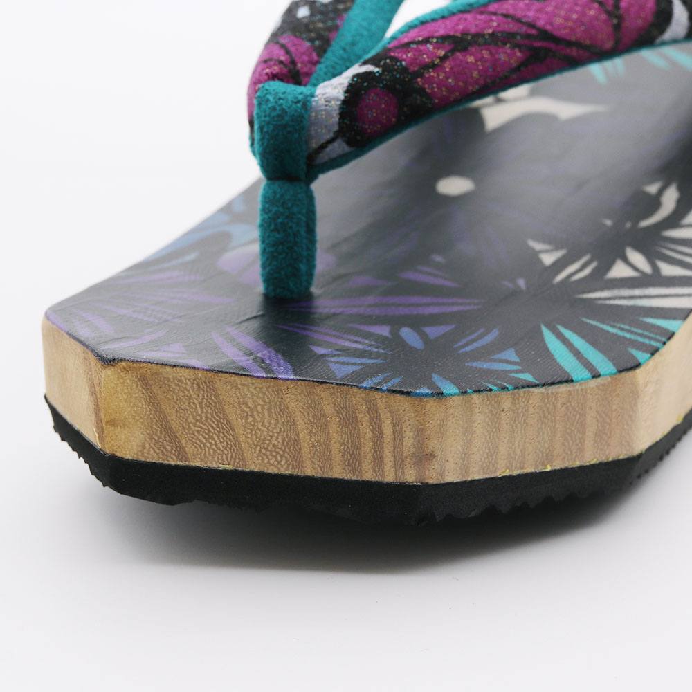 角ばったフォルムは、履いた時に指がはみ出さないように考えられたデザイン。鼻緒も台に合わせてひとつひとつ選ばれているので、全体を通して完成度の高い仕上がりになっています。