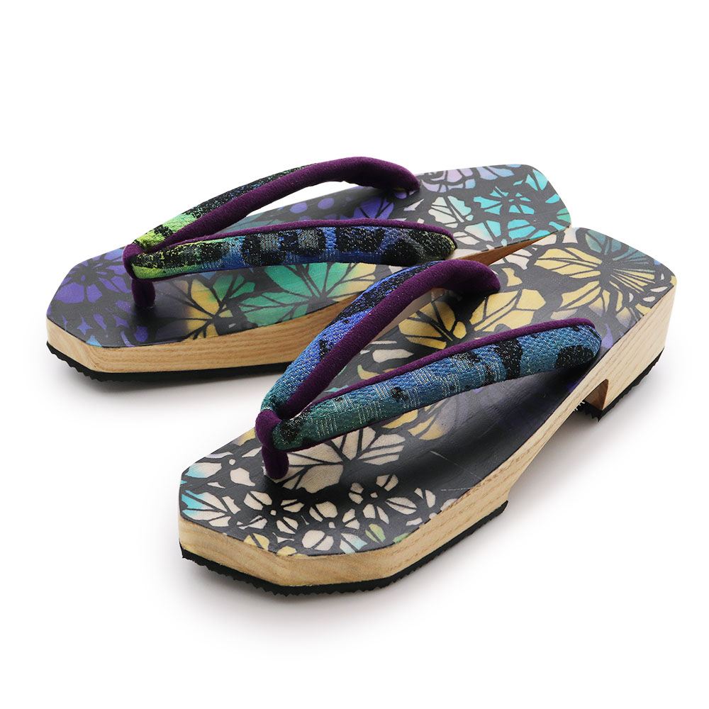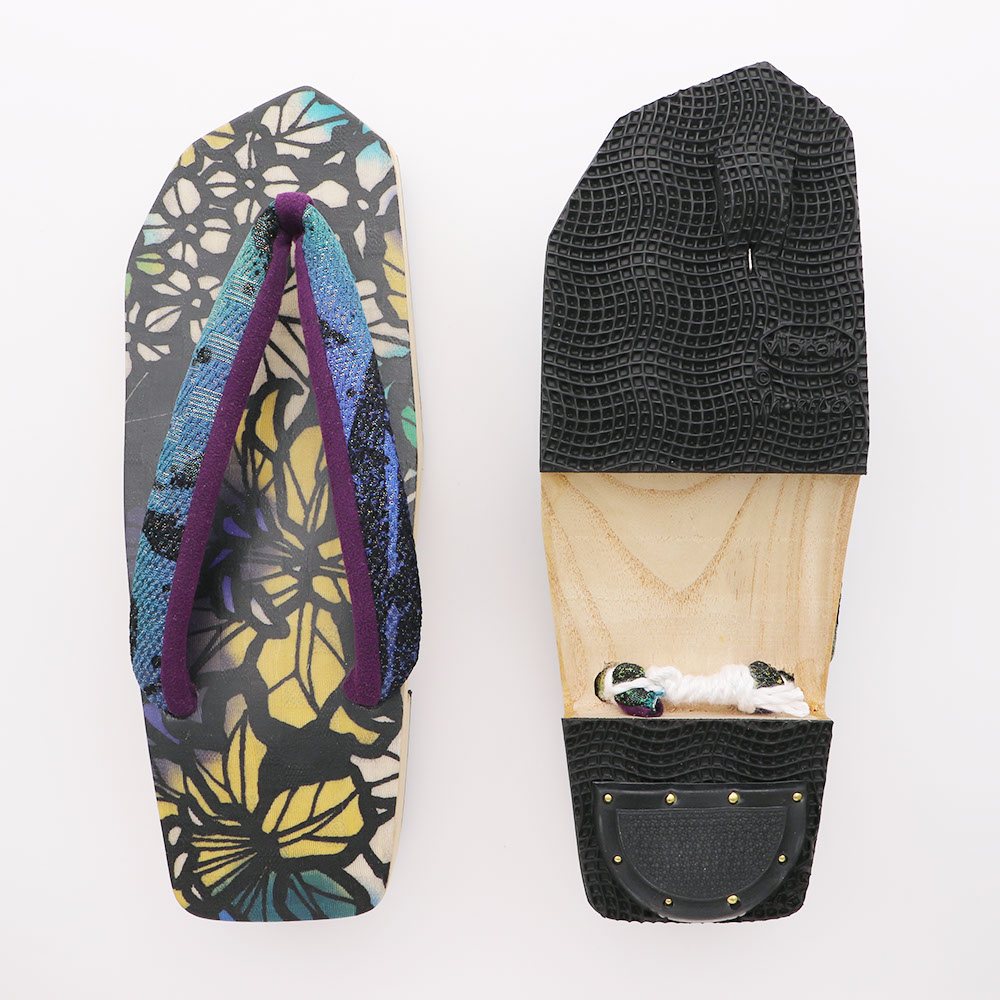 こちらの下駄は、黒澤桐材店の職人の手作業によってつくられた桐台に、小室庵による染生地を全面に張った一足。桐材の美しい木目と染生地の調和があなたの足を飾ります。