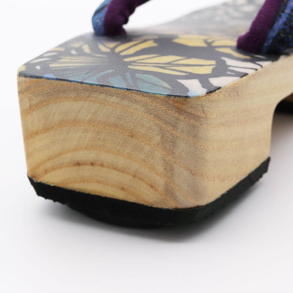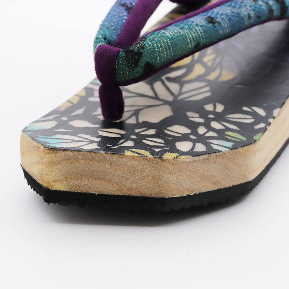 角ばったフォルムは、履いた時に指がはみ出さないように考えられたデザイン。鼻緒も台に合わせてひとつひとつ選ばれているので、全体を通して完成度の高い仕上がりになっています。