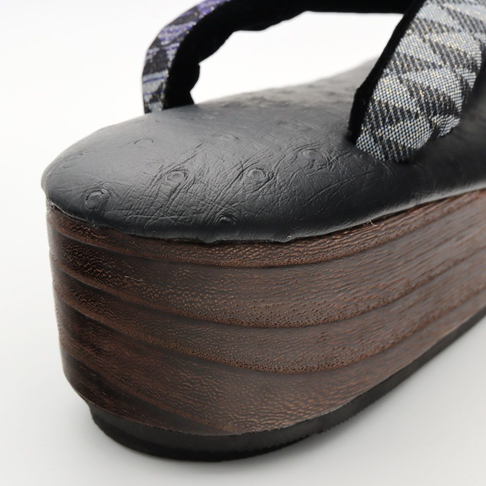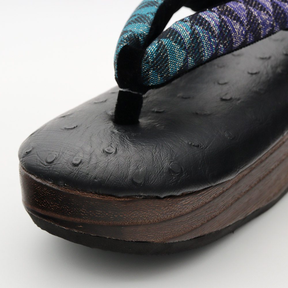 オーストリッチのような天にはPVCを、鼻緒には箔糸が輝く鱗模様の絹生地を使用し、草履のようなシックなデザインを実現。安定感のある台には、桐を使用して下駄のような軽やかさを持ち、デザイン性と機能性を兼ね備えました。
