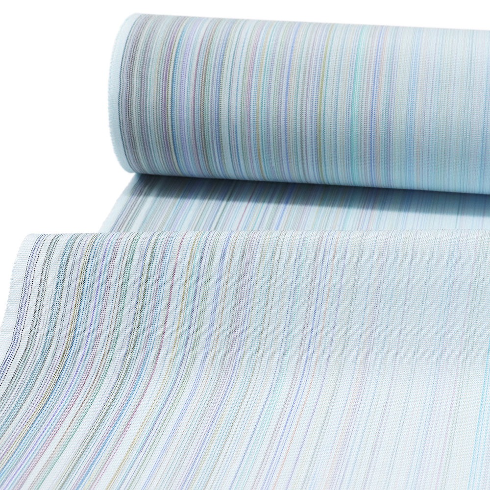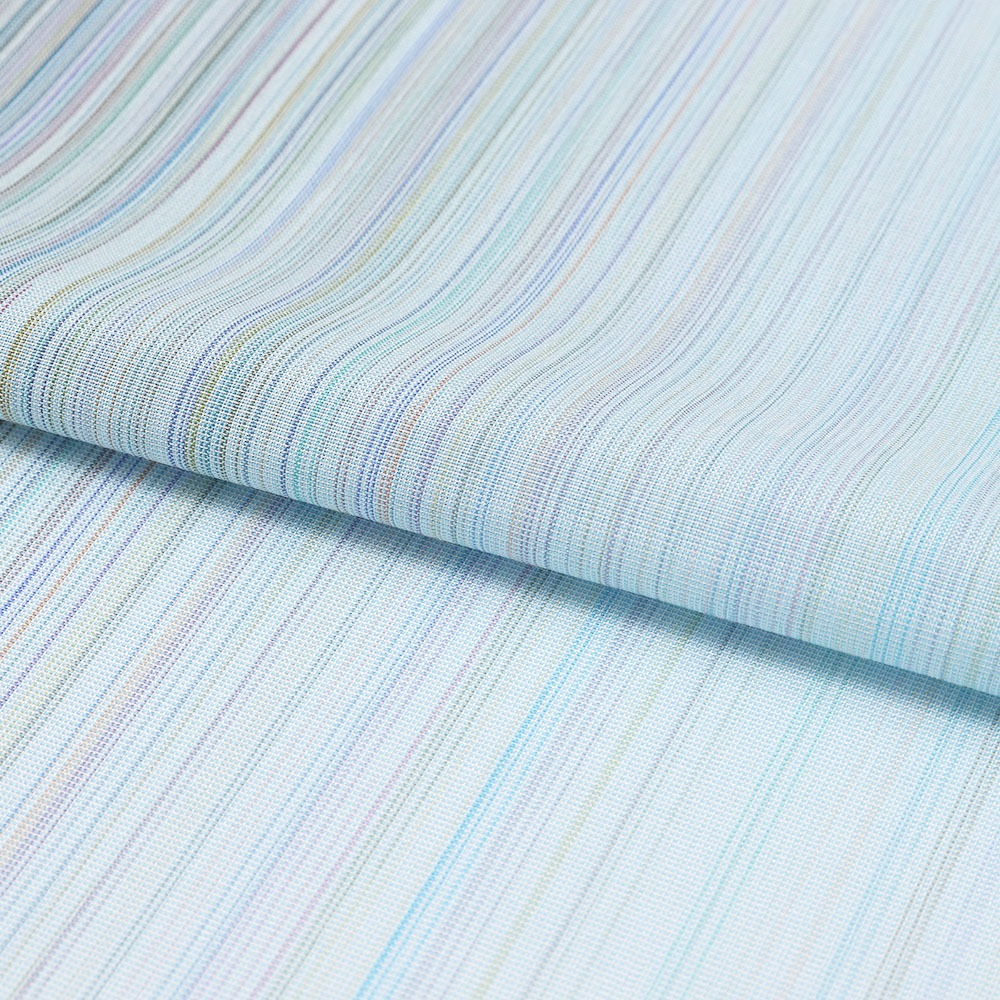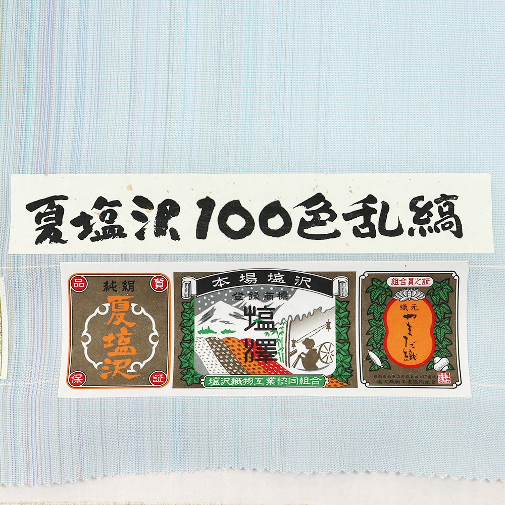 『100色乱縞』の名の通り、様々な色の糸を用いて片身に乱縞を表現。透き通るような水色の地に彩りを加えた雅なデザインに、夏塩沢の風合いで、夏の着姿を粋に、風流に演出します。