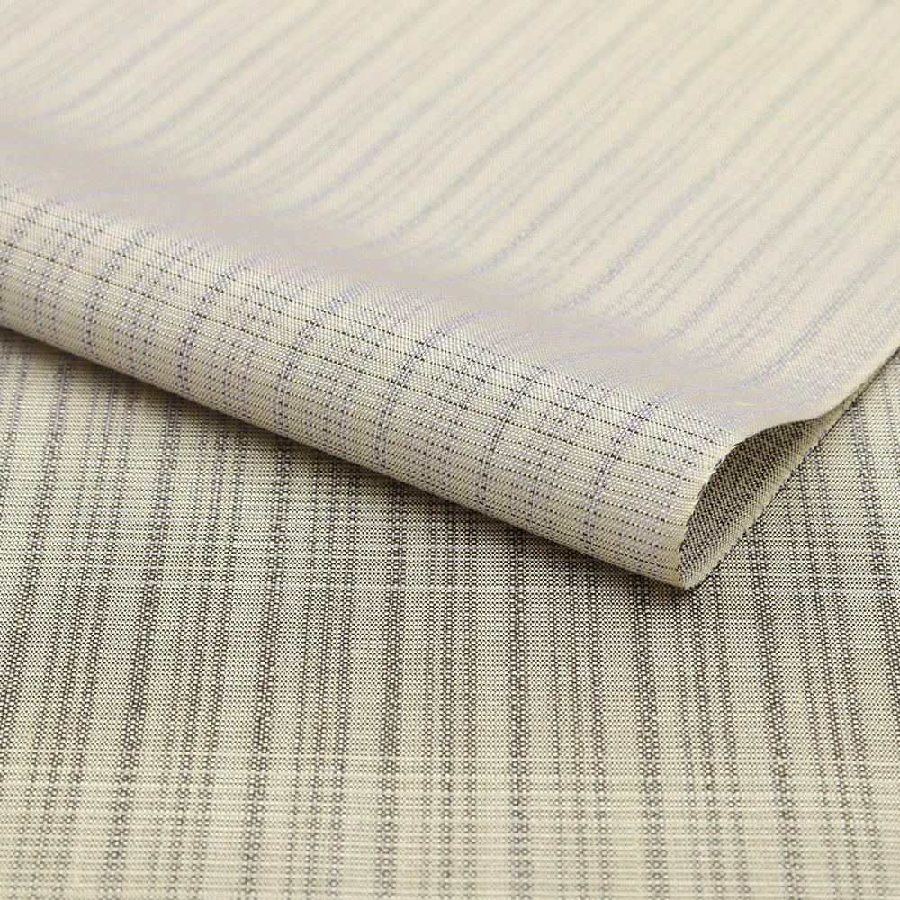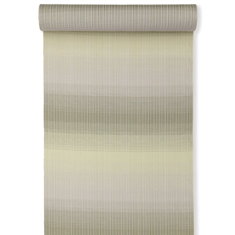 縞と段ぼかしを織りだした、透け感かろやかな夏紬地は、落ち着いた配色と繊細な色の移り変わりが、シックで上品な印象に。紬ならではの節の風合いが、味わい深い着姿へ導きます。小物合わせはもちろん、うっすら透け見せさせる襦袢選びにも力が入りますね。