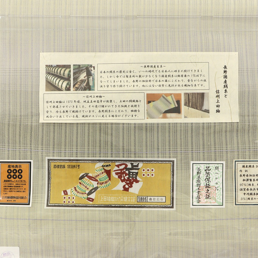 上田紬織物協同組合が認定する六文銭印の証紙がついた、希少価値の高い一本です。