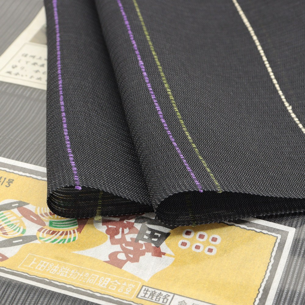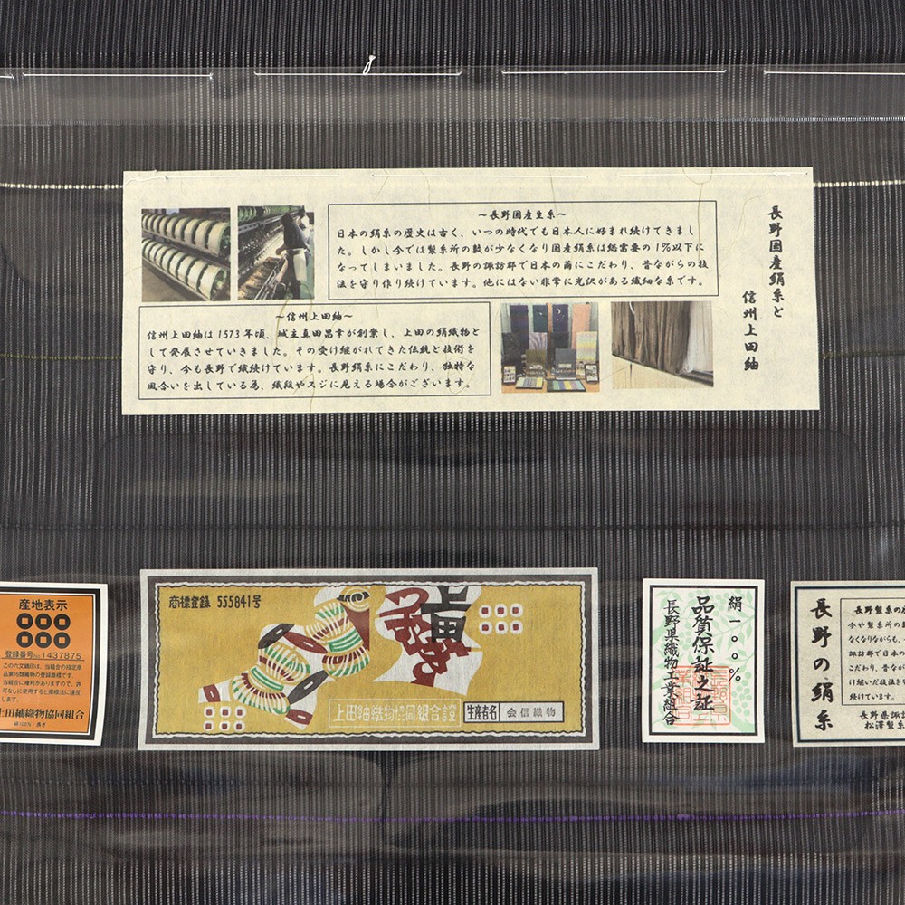 上田紬織物協同組合が認定する六文銭印の証紙がついた、希少価値の高い一本です。