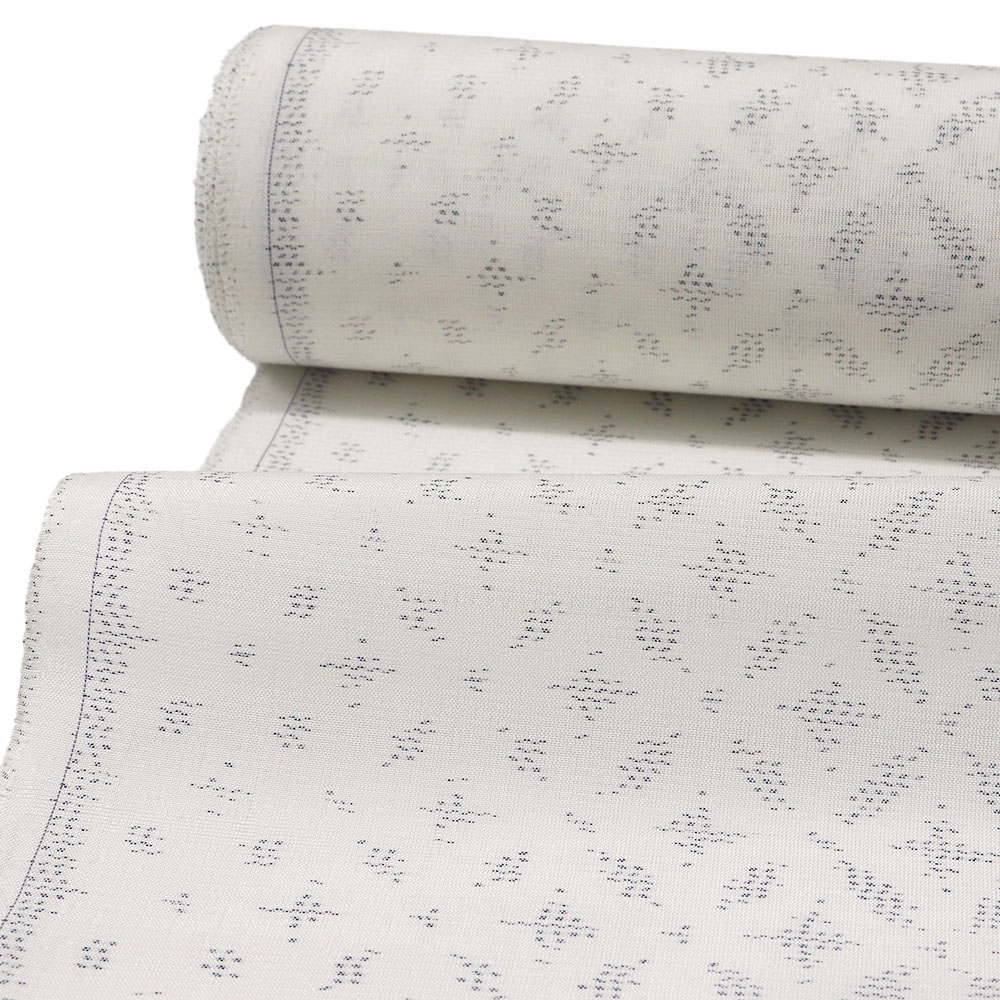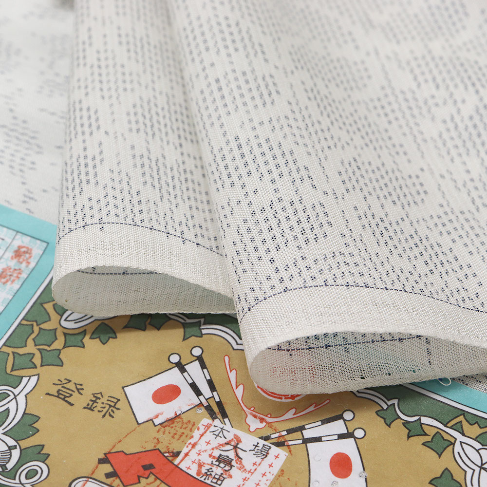 強く撚りをかけた糸で織り上げた低密度で控えめな透け感をもつ夏大島。緯糸に絣糸を使い描かれた柄行きは上品な質感を持ち、カジュアルすぎない夏の大人着物を演出するのにふさわしい逸品です。