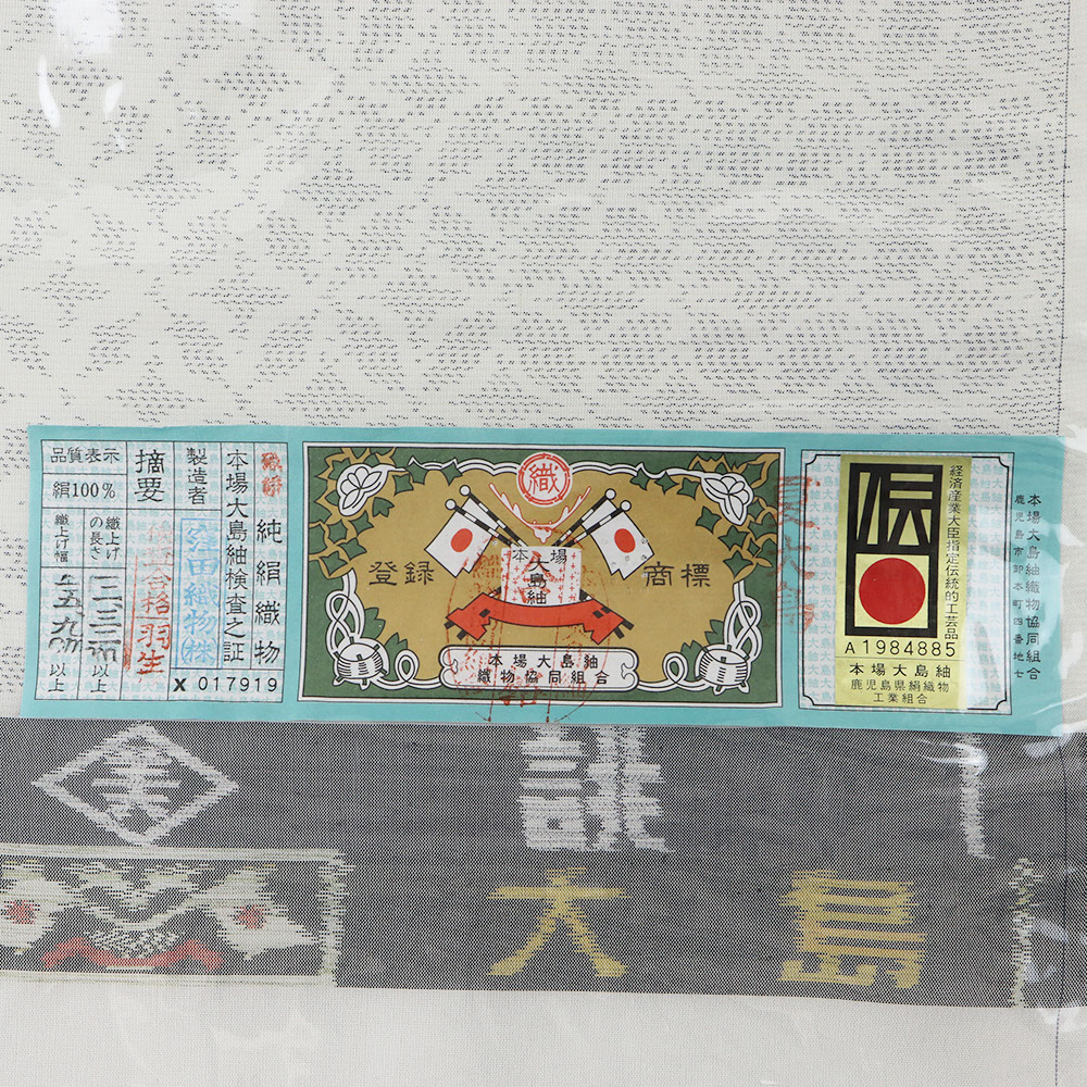 絣糸を使用した大島紬のみ貼られる「水色証紙」、手織りであることを証明する伝統工芸マークが貼られた夏大島紬。