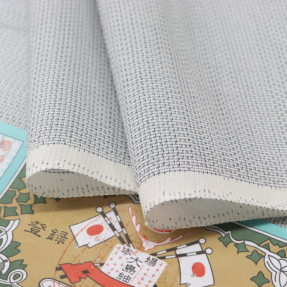 強く撚りをかけた糸で織り上げた低密度で控えめな透け感をもつ夏大島。緯糸に絣糸を使い描かれた柄行きは上品な質感を持ち、カジュアルすぎない夏の大人着物を演出するのにふさわしい逸品です。