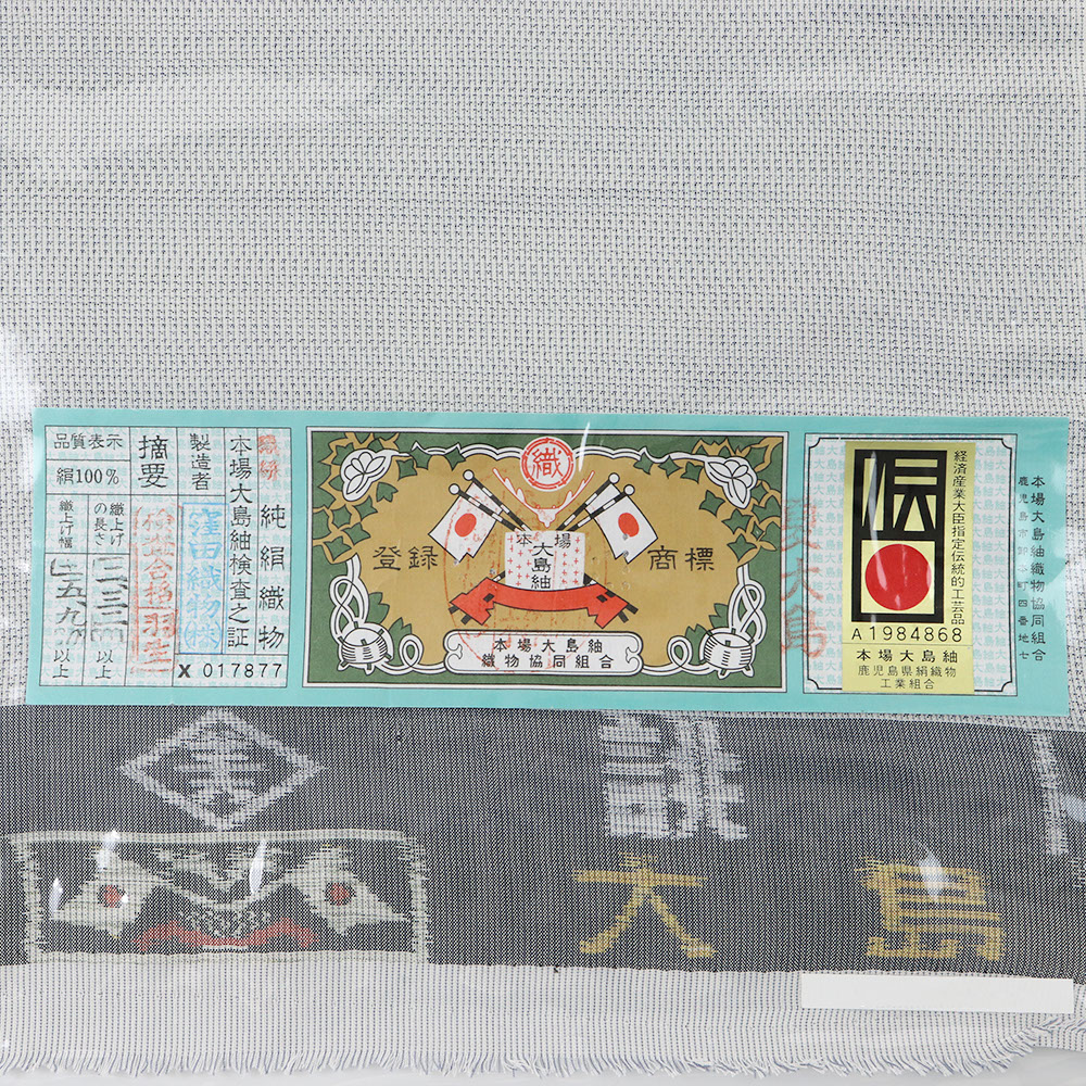 絣糸を使用した大島紬のみ貼られる「水色証紙」、手織りであることを証明する伝統工芸マークが貼られた夏大島紬。