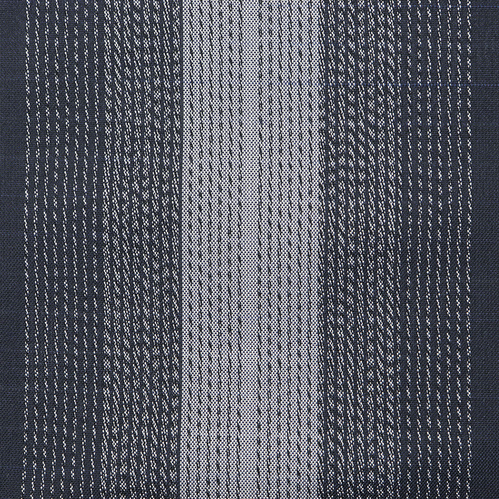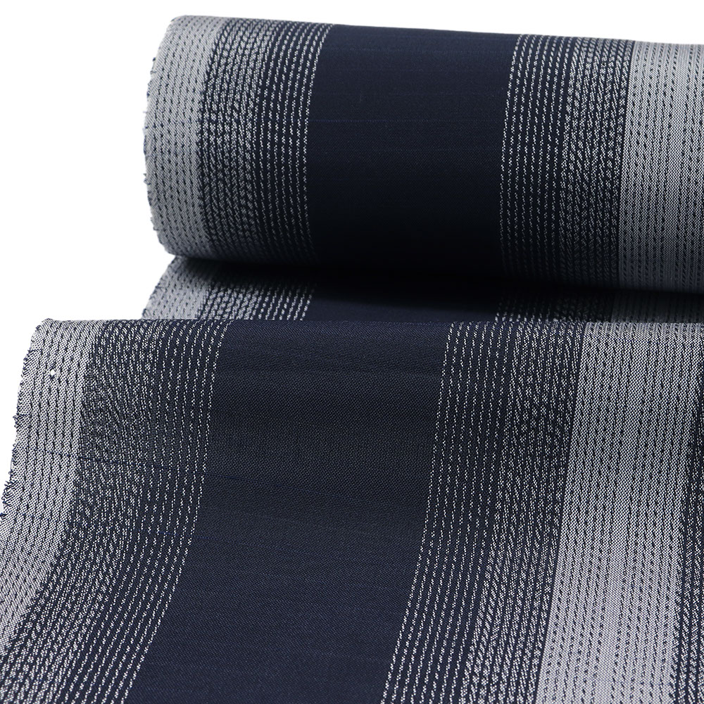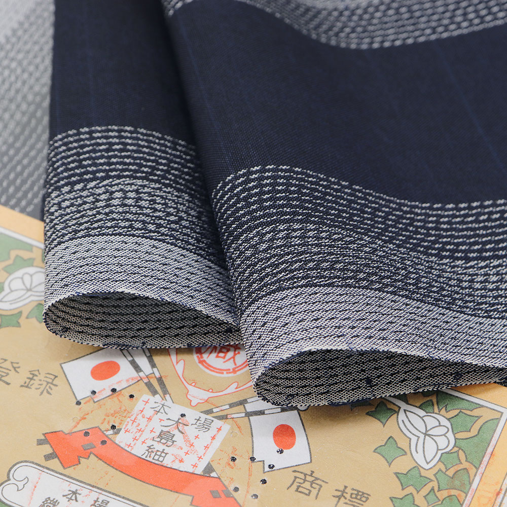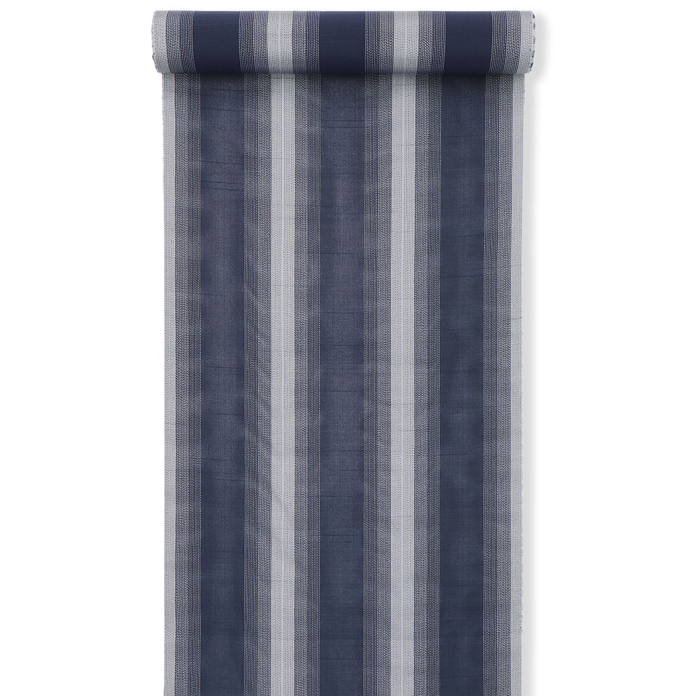 強く撚りをかけた糸で織り上げた低密度で控えめな透け感をもつ夏大島。紺を基調に青や灰色など、落ち着いたカラーの縞模様が織り上げられており、幅広い帯合わせと粋な着こなしができる一枚です。無地色の帯で着姿を引き締めるもよし、柄物でモダンに合わせるもよし、コーディネートを考える時間も楽しそうですね。
