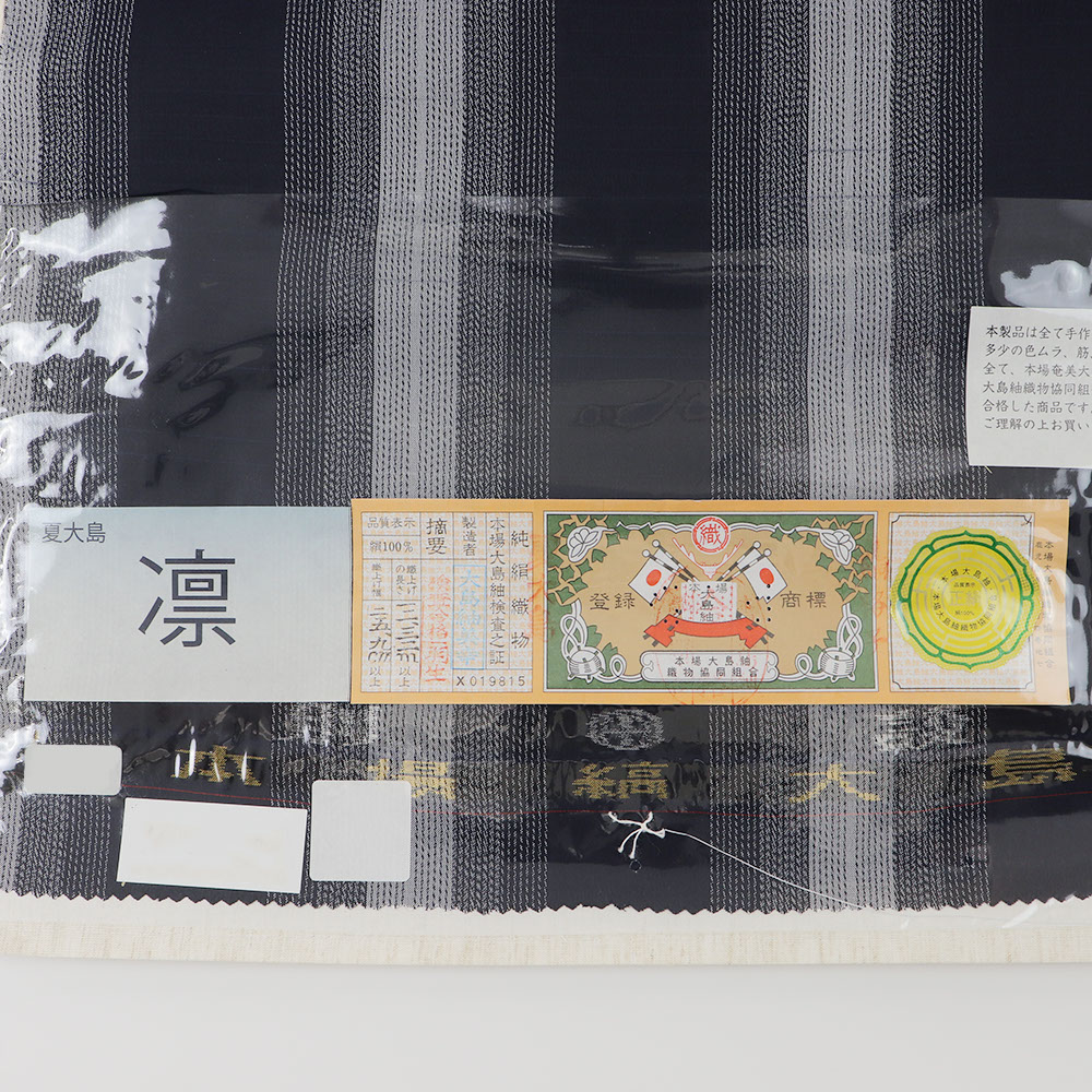 本場大島紬の認定証紙が貼られた縞大島紬。