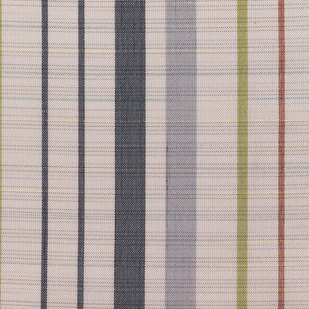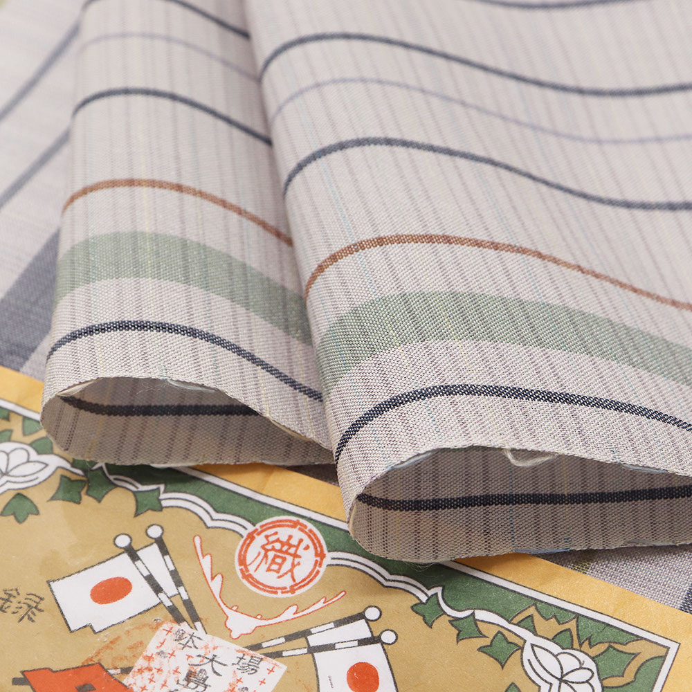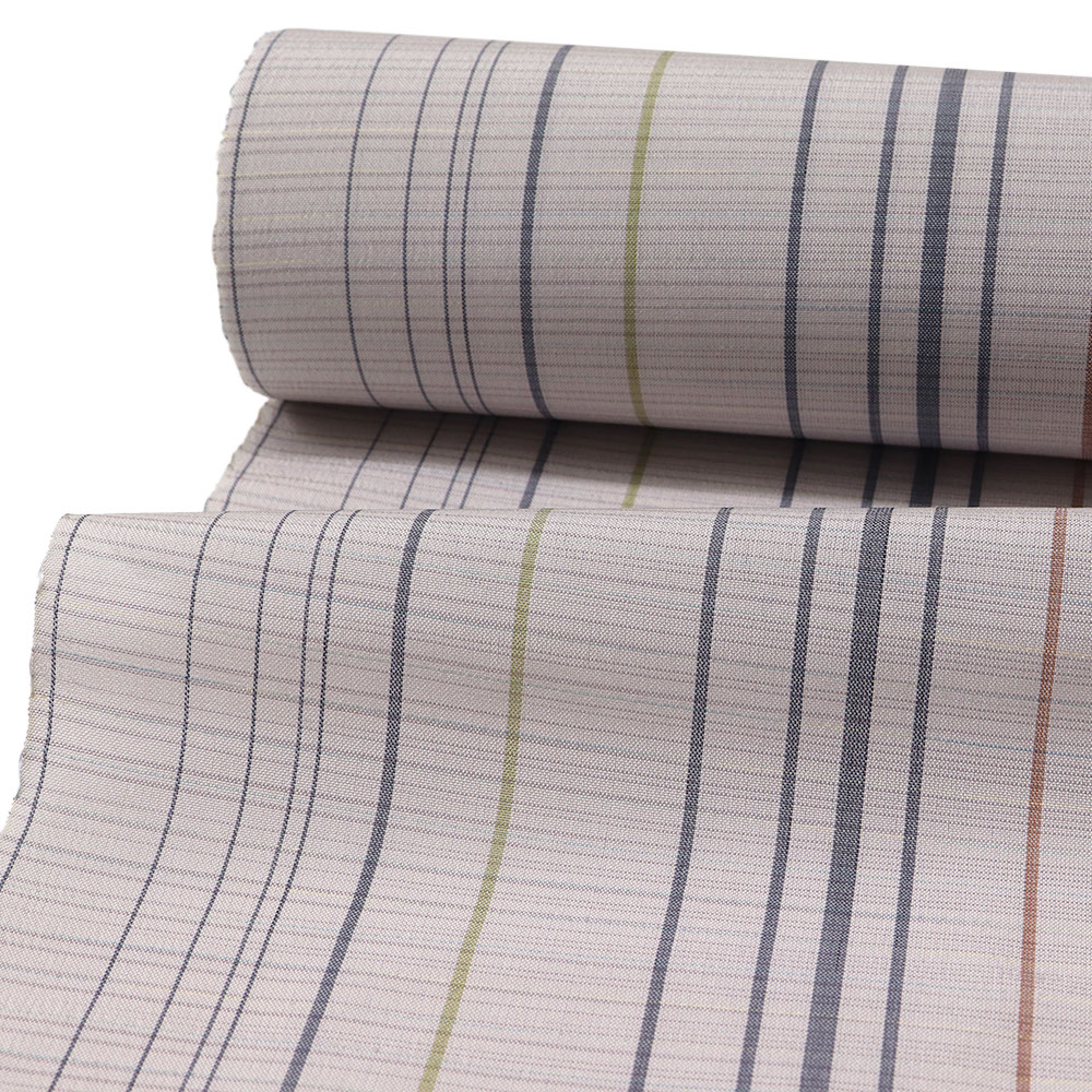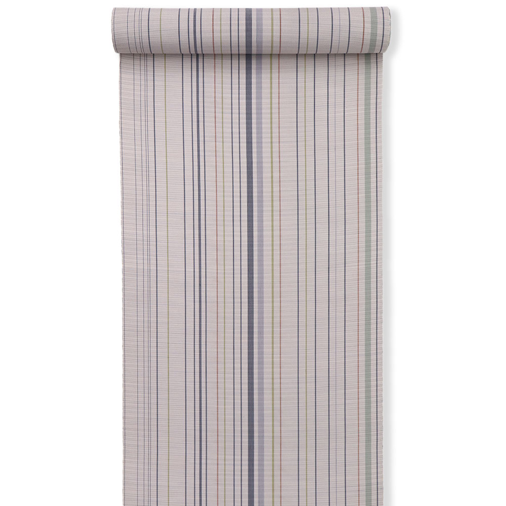 強く撚りをかけた糸で織り上げた低密度で控えめな透け感をもつ夏大島。上品な薄藤色を基調に、橙や青の矢鱈縞で抜け感を持たせたモダンデザインになっています。定番の縞模様は幅広い帯合わせが魅力なので、無地色から柄物の帯や、合わせる小物を選ぶ時間も楽しそうです。
