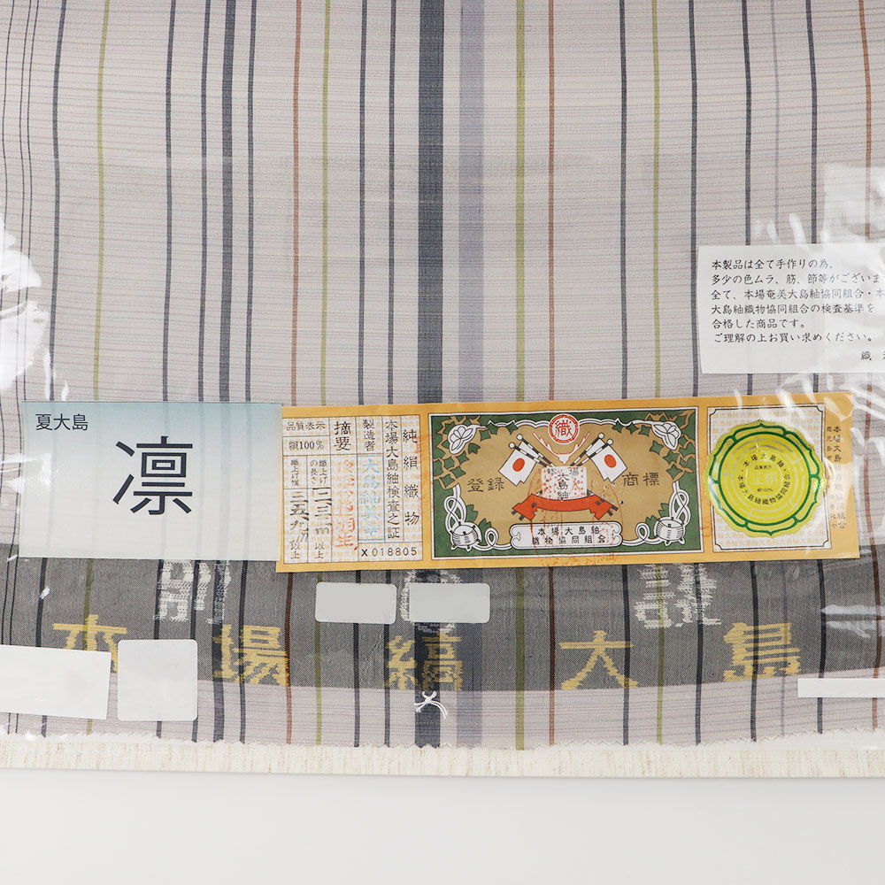 本場大島紬の認定証紙が貼られた縞大島紬。