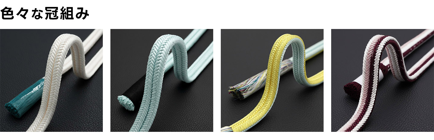 字の通り、平安時代の貴族の「冠(かんむり)」を止めるために結んだ紐の組み方で組まれたものになります。平組よりも少し細めで、ほどよい弾力性があって、とても扱いやすいですよね。