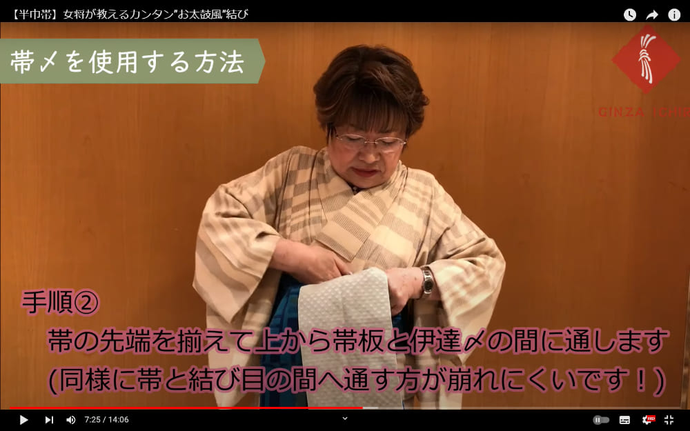 詳しく知りたい方は、私のYouTubeの帯〆の締め方を参考にしてみてください。